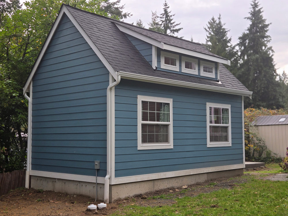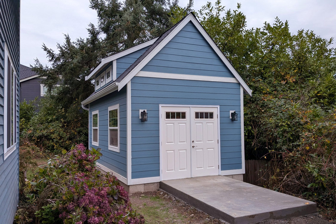 Story: A great couple from Seattle was remaking their outdoor backyard space and found themselves in need of a storage shed. We were able to customize this shed by painting their shed to match their main house and provide a loft area to maximize their storage space.