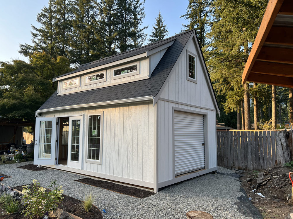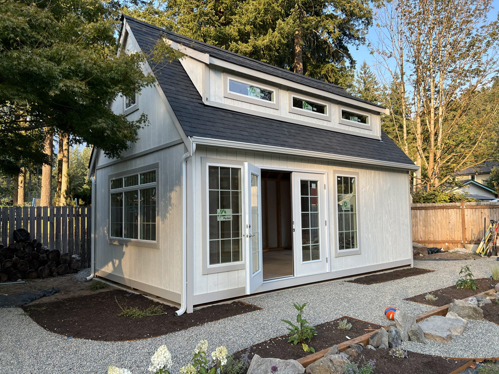 Story: A gentleman from Redmond came to us for a custom-built shed that he could use as his home office. We placed this in the perfect location so while he works he can keep an eye on his kids playing in the yard!